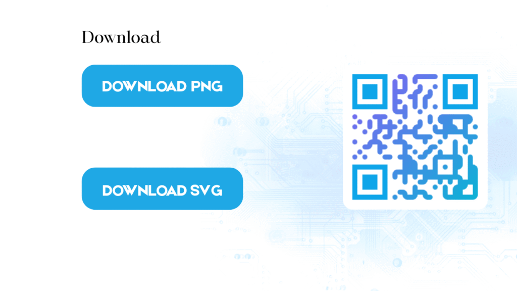 Once your design is ready, simply download the QR code in PNG or SVG format. Get your customized QR code instantly — completely free.